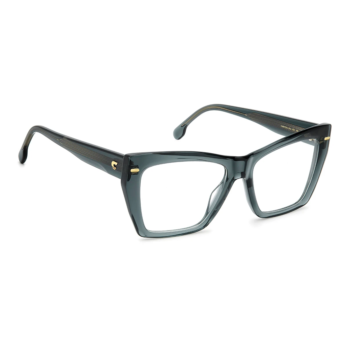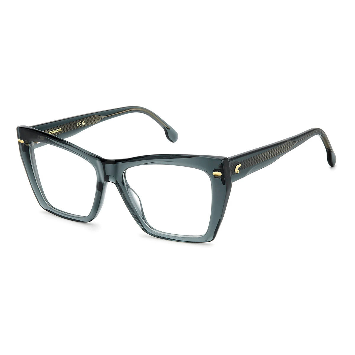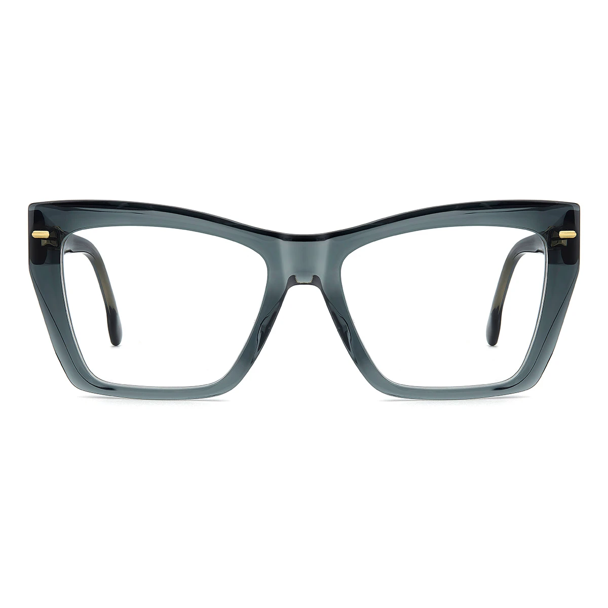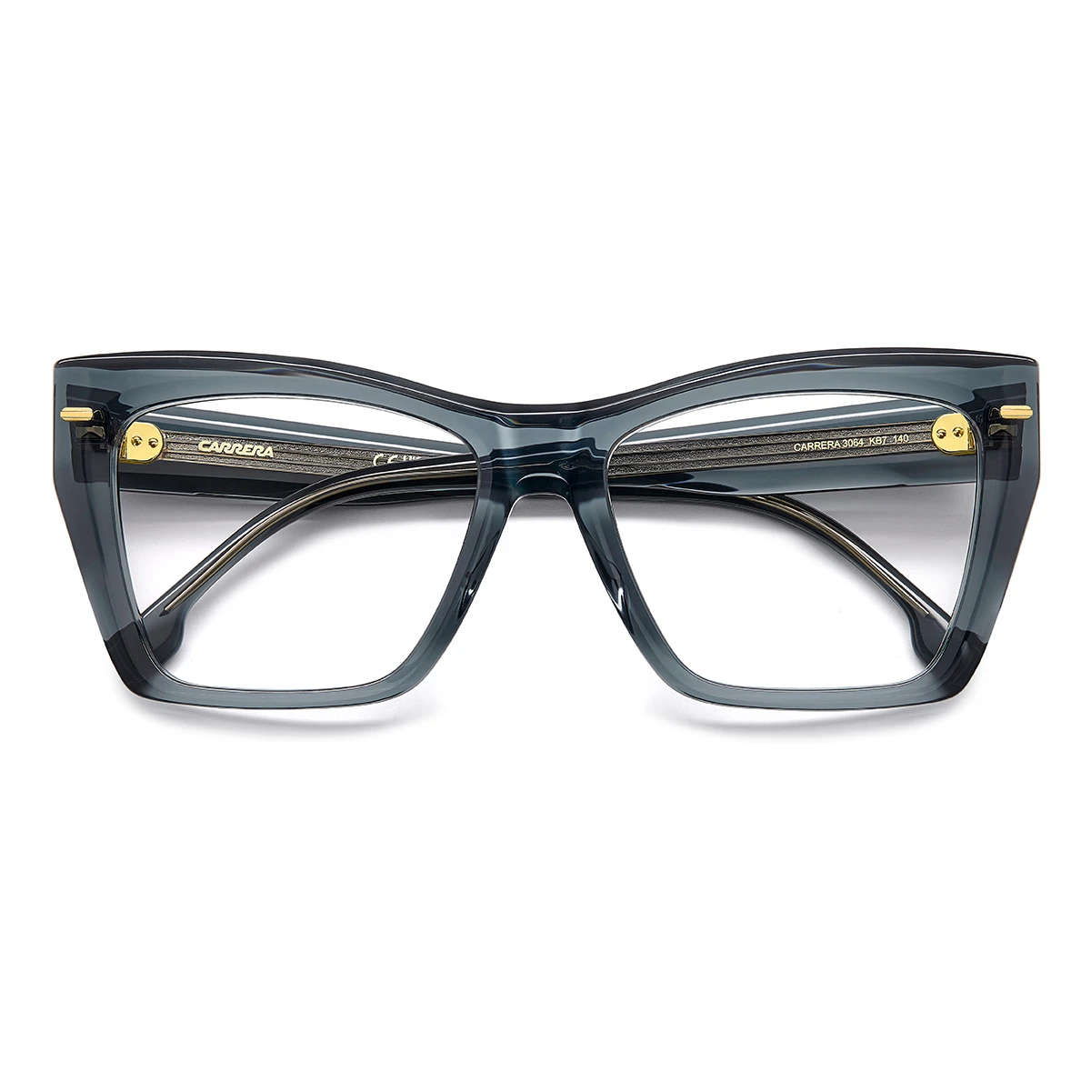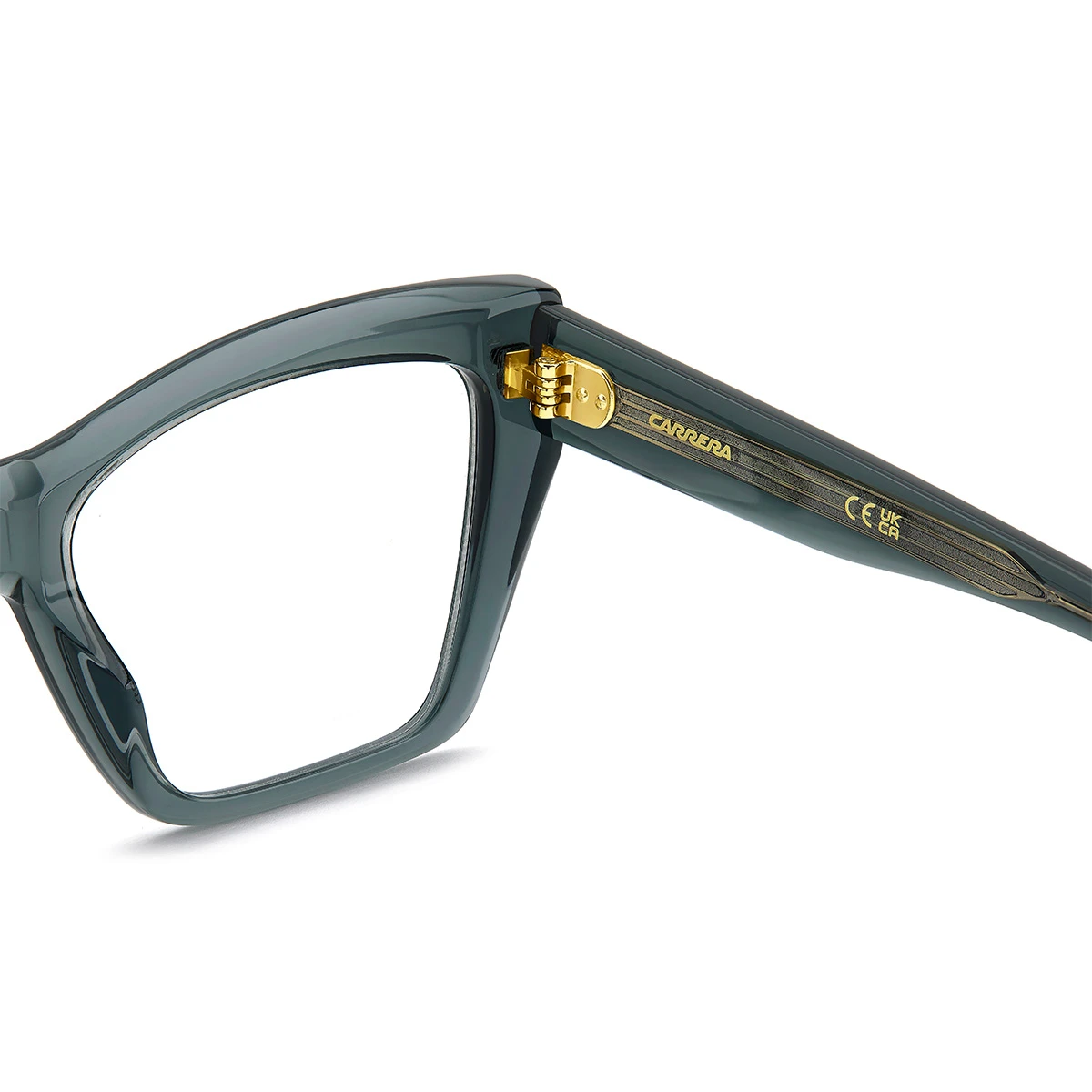 Masywne oprawki damskie wykonane z wysokiej jakości acetatu w półtransparentnym, grafitowym kolorze. Tarcze w kształcie kociego oka z mocno zarysowaną górną linią i wyciągniętymi bokami, które tworzą dynamiczną, geometryczną sylwetkę. Zauszniki z delikatnym żłobieniem i wtopionymi złotymi detalami – w tym charakterystycznym logo Carrera w okolicach zawiasów. Całość tworzy wyrazistą i stabilną konstrukcję o mocnym charakterze i spójnej formie.