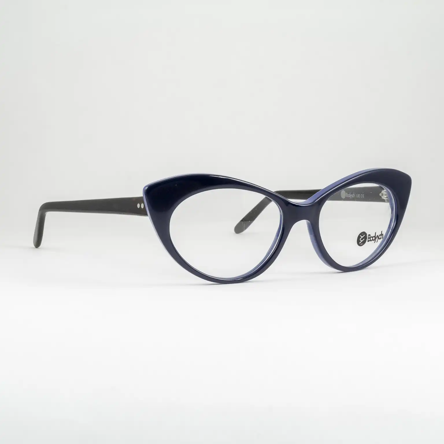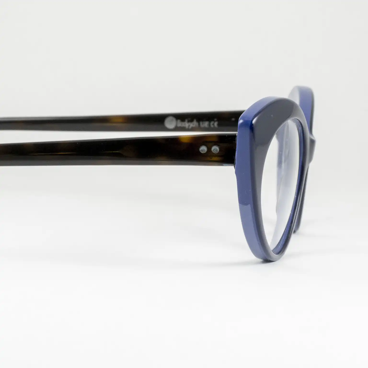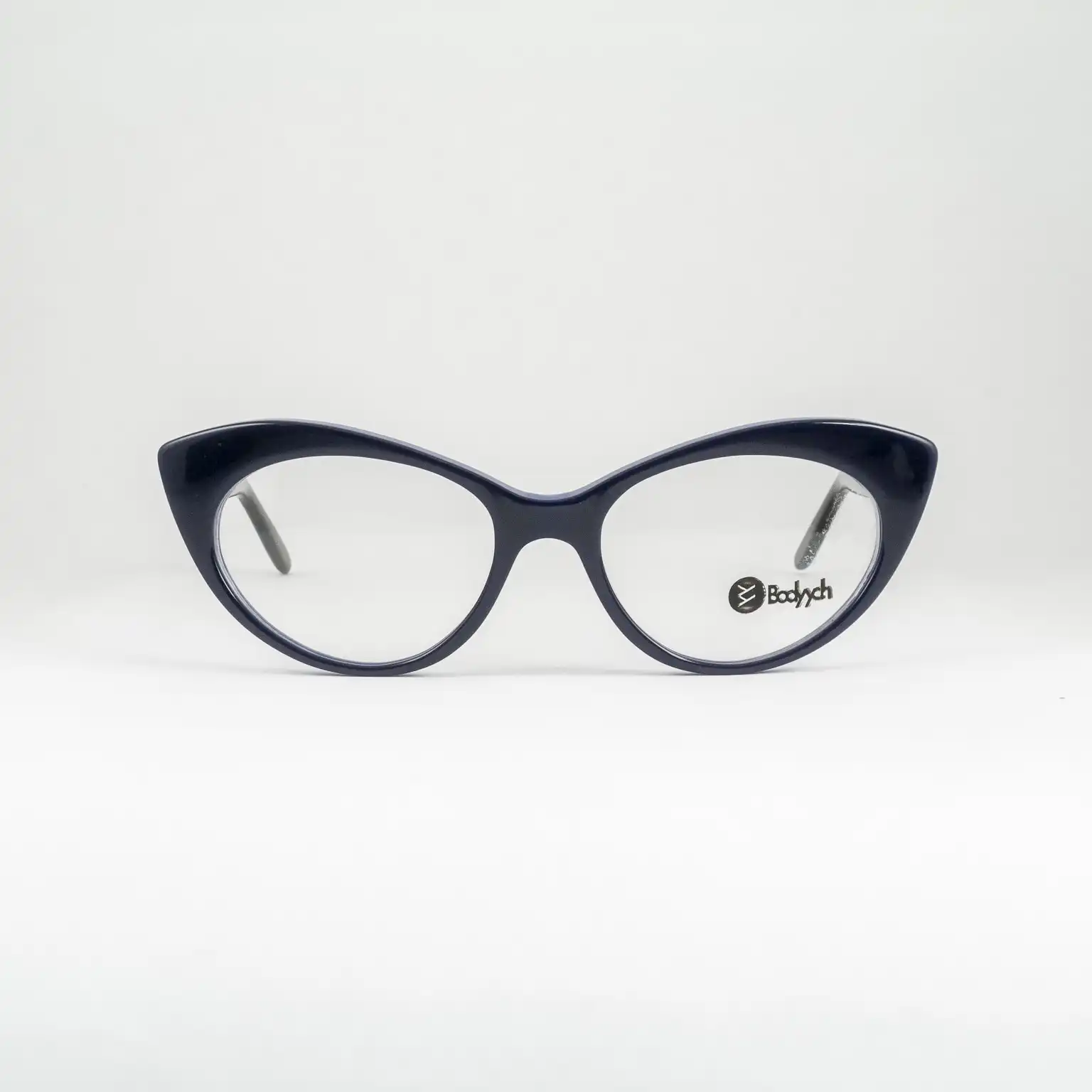 Oprawki damskie marki Bodyych. Niewielkie tarcze mocno wyciągnięte ku górze w kształt kociego oka. Front w kolorze granatowym, od wewnątrz podbity pastelowym niebieskim i błękitem. Zauszniki w ciemnym szylkrecie. Minimalistyczne, srebrne nity przy zawiasach. Oprawki ręcznie wykonane w Polsce.