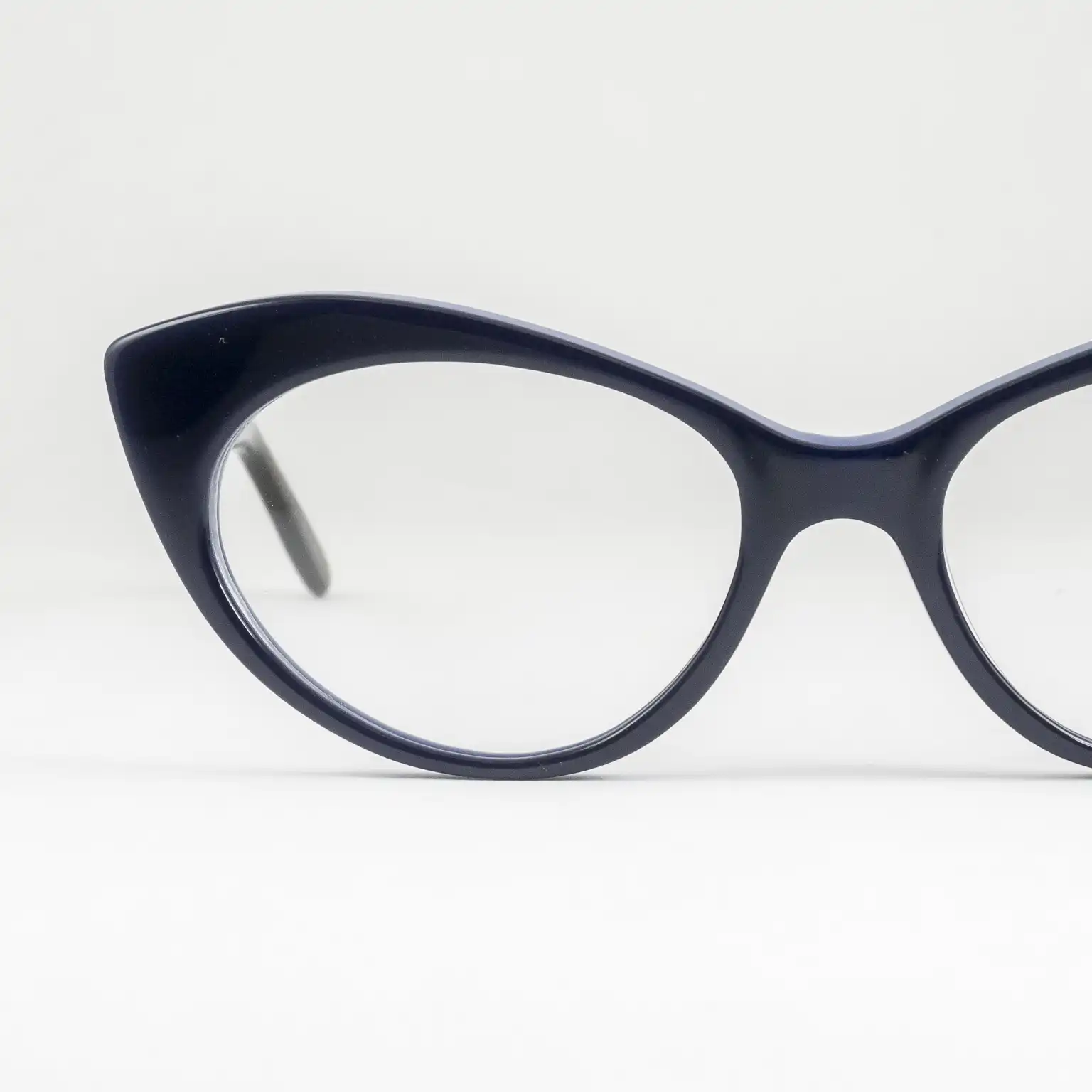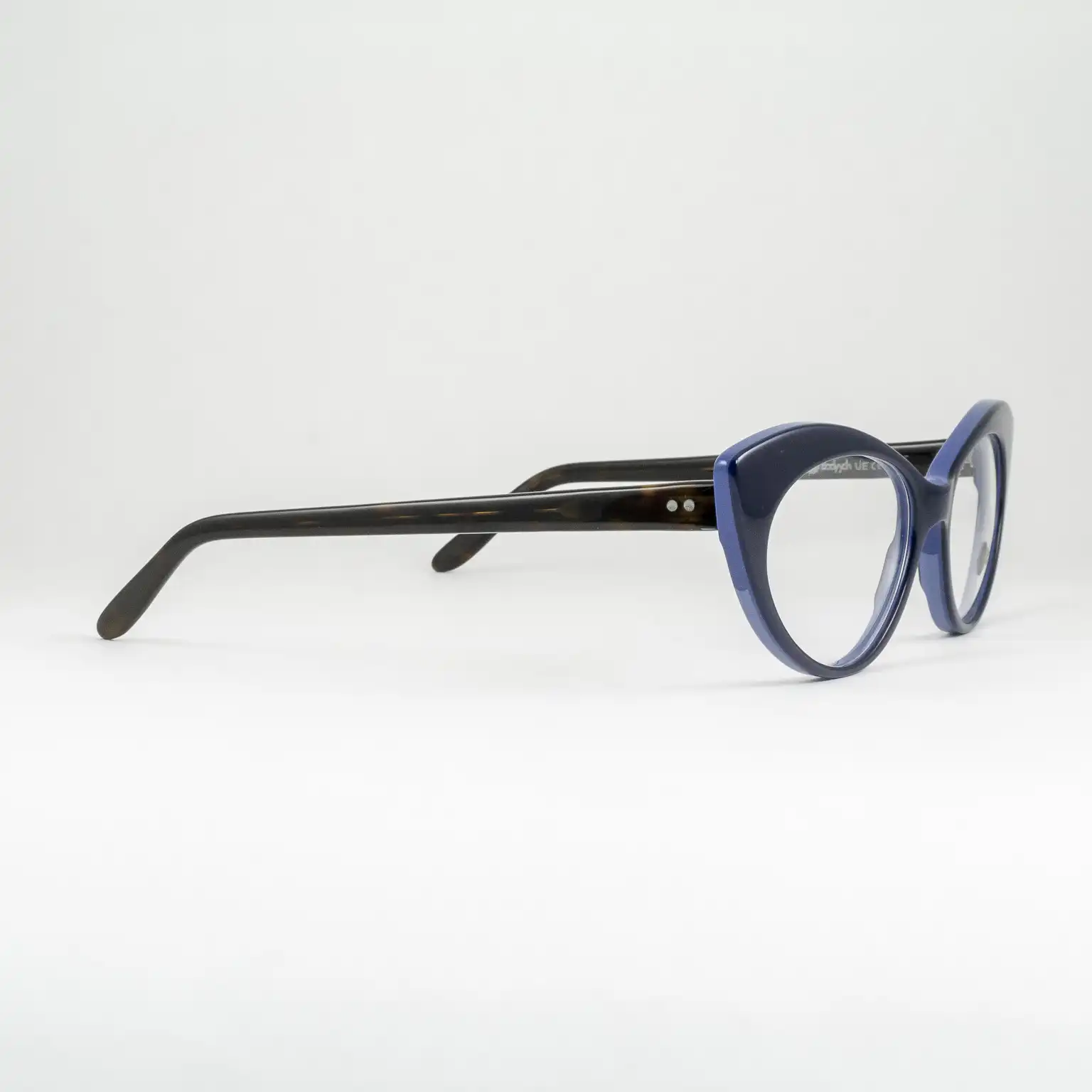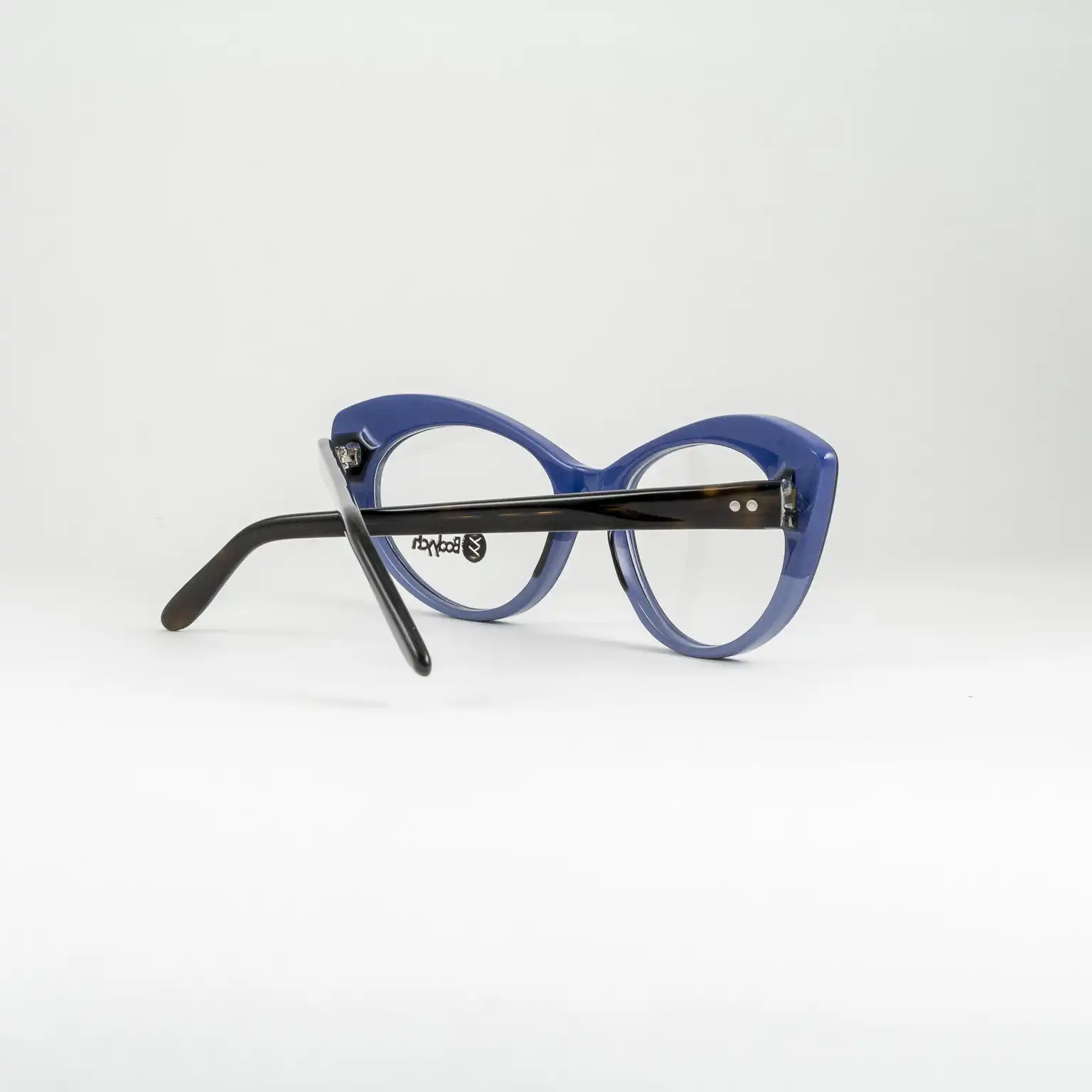 Oprawki damskie marki Bodyych. Niewielkie tarcze mocno wyciągnięte ku górze w kształt kociego oka. Front w kolorze granatowym, od wewnątrz podbity pastelowym niebieskim i błękitem. Zauszniki w ciemnym szylkrecie. Minimalistyczne, srebrne nity przy zawiasach. Oprawki ręcznie wykonane w Polsce.