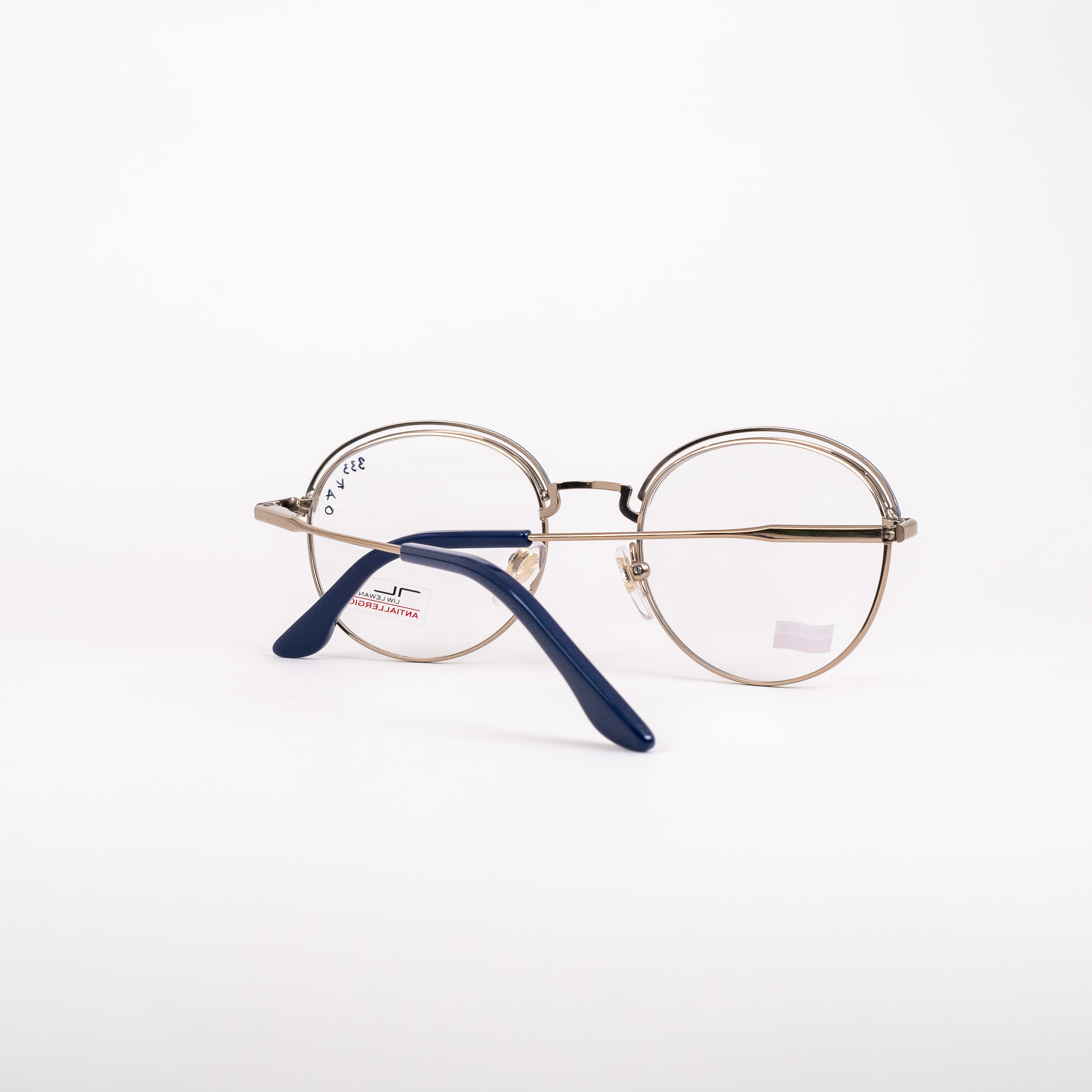 Ciekawe oprawki damskie o owalnych tarczach, od polskiej marki Liw Lewant. Dominujący metal w jasnej miedzi, plastikowe zakończenia zauszników w granacie. Nad tarczami intrygujące, szaro-błękitne elementy.